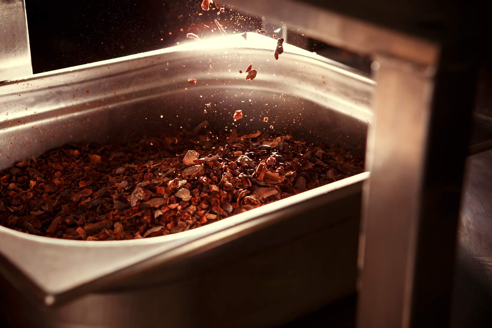 От прецизно подбраните сортове какао сортираме на ръка само най-добрите зърна. Какаовите зърна изпичаме на определени температури, пазени в тайна от нашия шоколатиер. По време на този толкова личен процес, благодарение на точно определения профил на печене, успяваме да развием скритите вкусове и аромати на какаовите зърна.